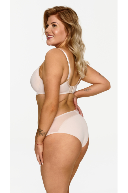 Biustonosz z miękkimi miseczkami na fiszbinach. Wykonany z połączenia gładkiej dzianiny oraz siatki w kolorze beżowym. Szerokość ramiączek i typ dopasowana do rozmiaru biustonosza.