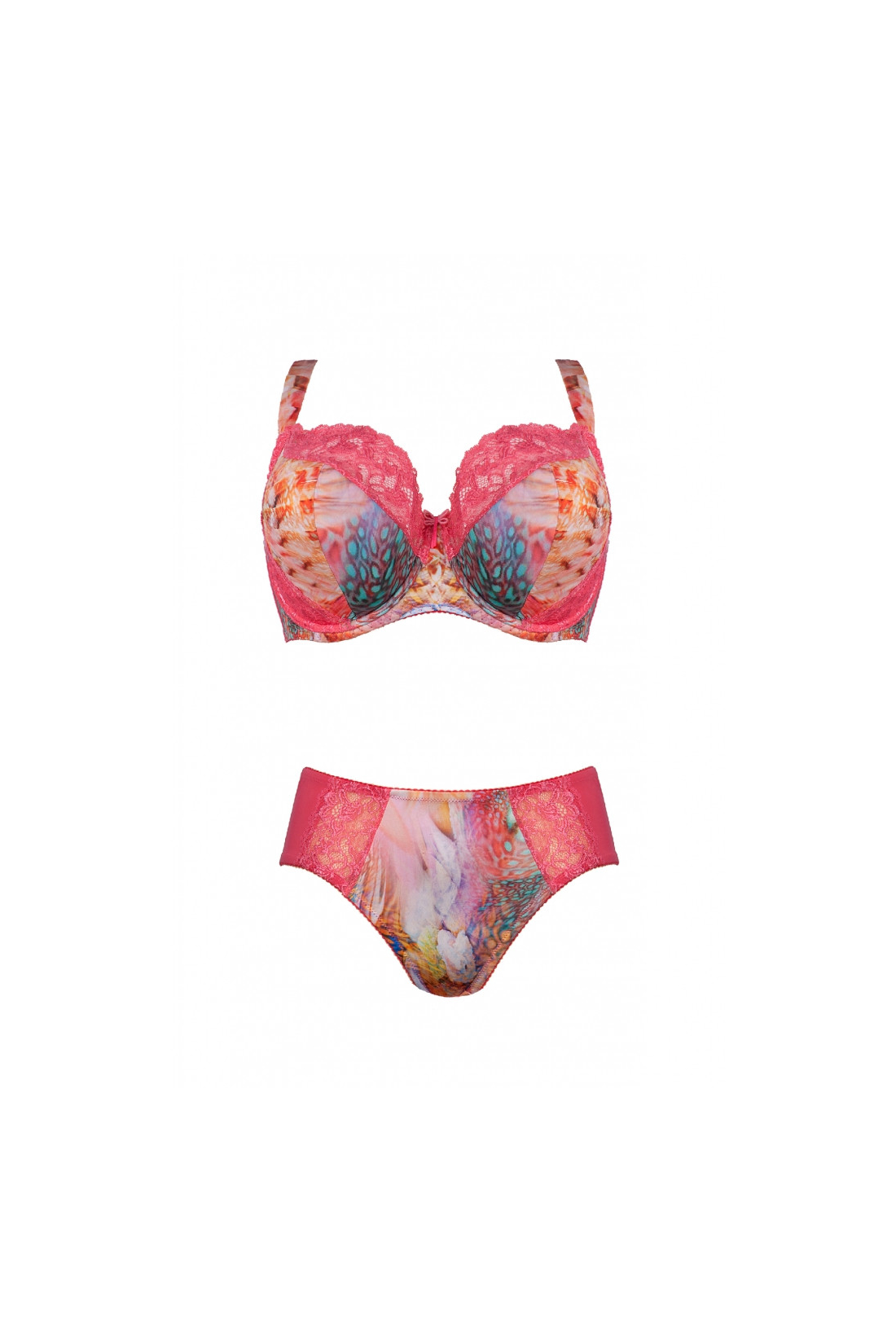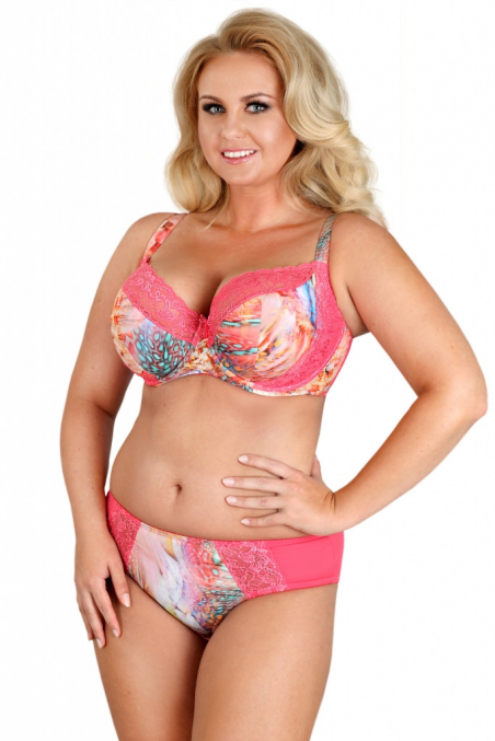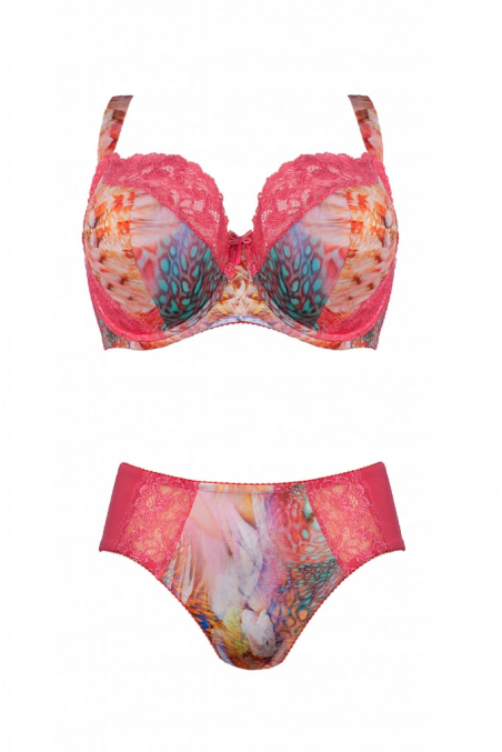 Figi z wyższym stanem, wykonane z połączenia drukowanej dzianiny oraz amarantowej koronki.