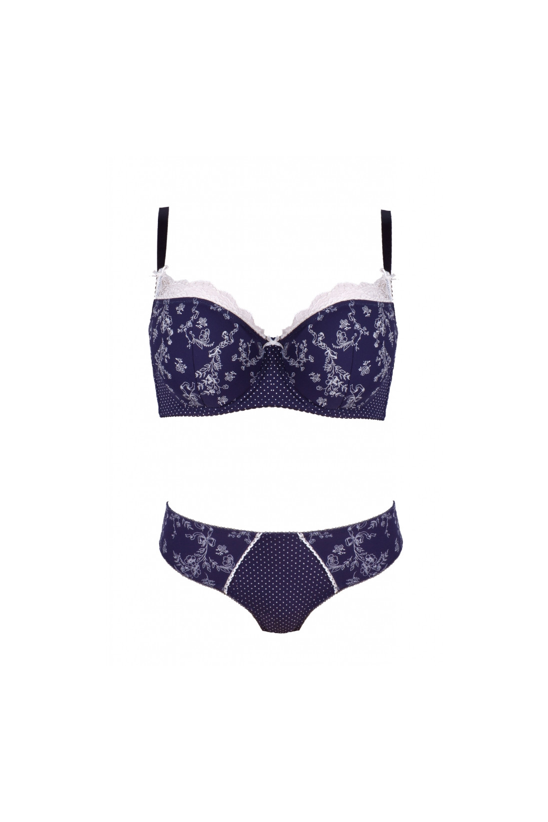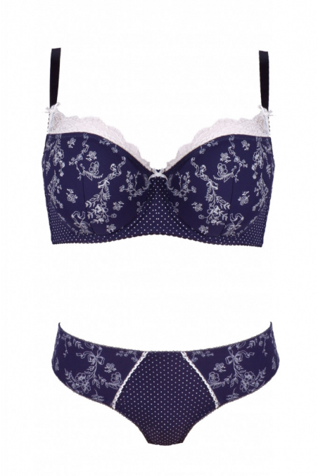 Elegancki biustonosz z miękkimi miseczkami dedykowany szczególnie Paniom z większym biustem. Miseczki wykonane z połączenia delikatnej dzianiny w granatowym kolorze z motywem kwiatowym, oraz białej koronki. U styku misek delikatna jasna kokardka dodająca szyku i elegancji całości. Miseczki z pionowym cięciem i z fiszbinami dają poczucie komfortu i stabilności. Ramiączka regulowane, nieodpinane.