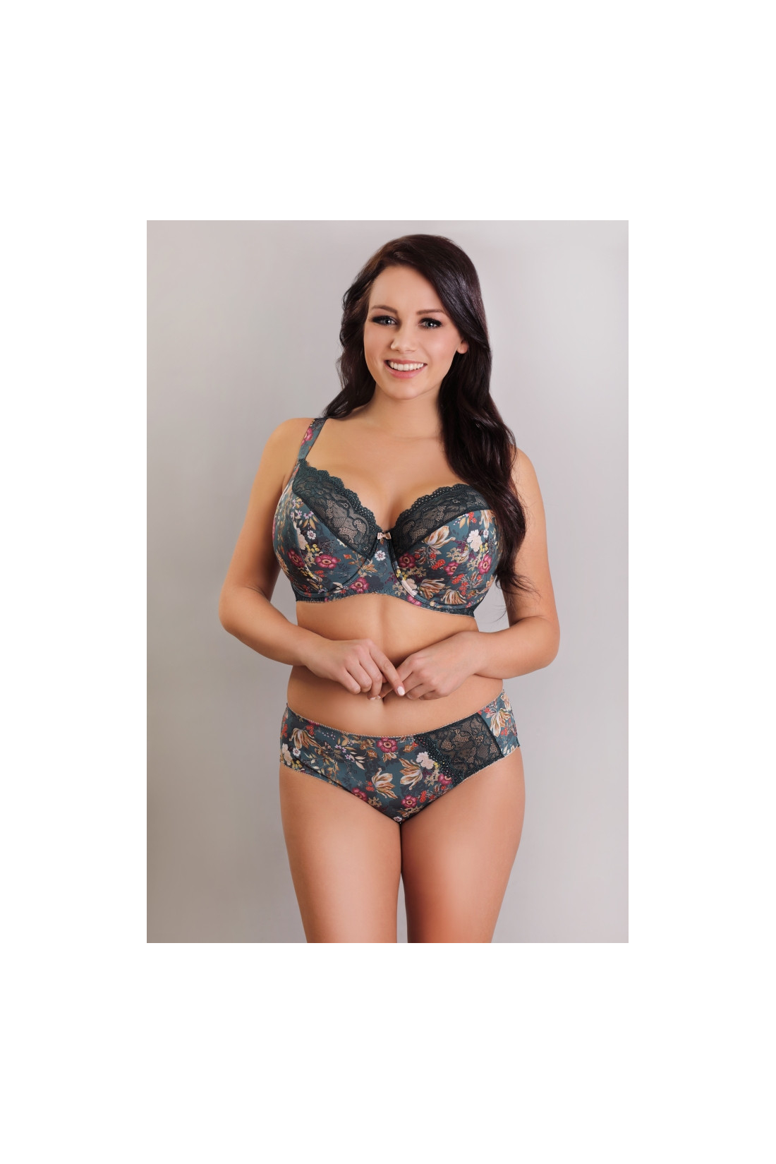 Biustonosz typu BIG semi soft z fiszbinami w szlachetnej, kwiecistej aranżacji. Będzie doskonały jeśli i Ciebie natura obdarzyła nieco hojniej i potrzebujesz modelu, który doskonale zbiera piersi i przede wszystkim utrzymuje je na właściwym miejscu. Dolna część miseczek wykonana z delikatnej dzianiny w kwiaty, górna zaś - z zielonej koronki. Dodatkowym atutem są ramiączka regulowane, które są wykonane z tej samej dzianiny co biustonosz, przez co idealnie współgrają z całością.