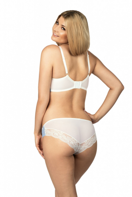 Biustonosz z miękkimi miseczkami na fiszbinach. Szerokość ramiączek i typ zapięcia dopasowana do rozmiaru biustonosza.