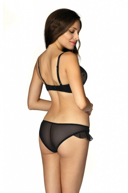 Czarne spodenki ozdobione falbanką.