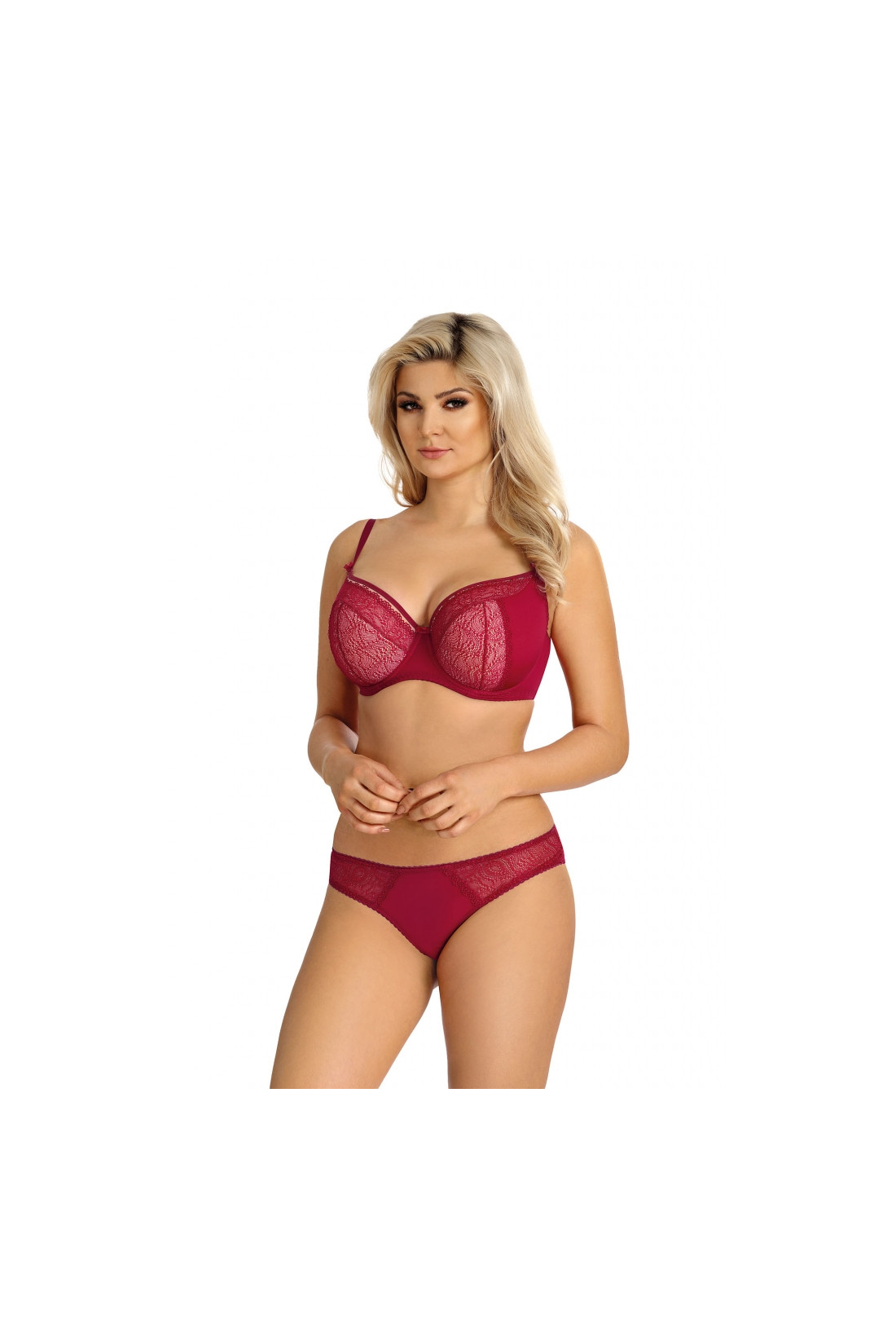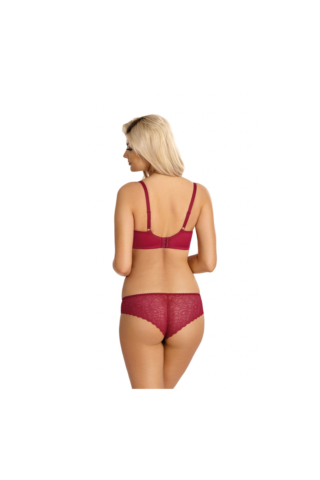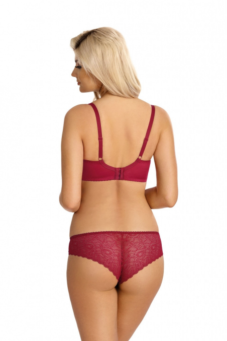 Klasyczne figi z wyższym stanem, zachowane w bordowej kolorystyce. Tył w całości wykonany z koronki.