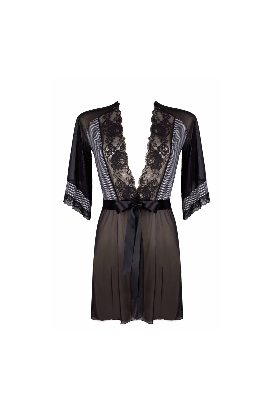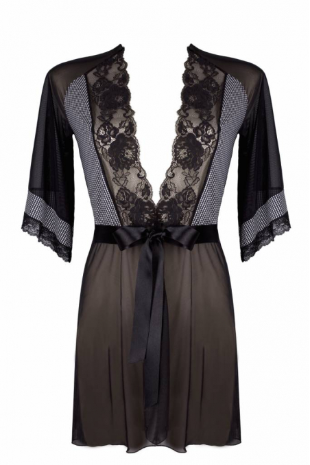 Tiulowy peniuar wykończony pięknym drukiem z przodu i wiązany na zalotną kokardkę, niewątpliwie zniewoli każdego mężczyznę. Może stanowić dodatek do koszulki, biustonosza oraz stringów.