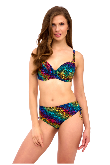 Biustonosz bikini przeznaczony dla kobiet ze średnim i dużym biustem. Biustonosz wykonany z dzianiny w pięknych kolorach, które imitują tęczę. Posiada miękkie miseczki z modelującymi cięciami oraz jest usztywniony fiszbinami, dzięki czemu doskonale podtrzymuje biust. Ramiączka regulowane, nieodpinane. Szerokość ramiączek i typ zapięcia dopasowany do rozmiaru kostiumu. Miedzy miseczkami delikatna ozdoba dodająca uroku całości.