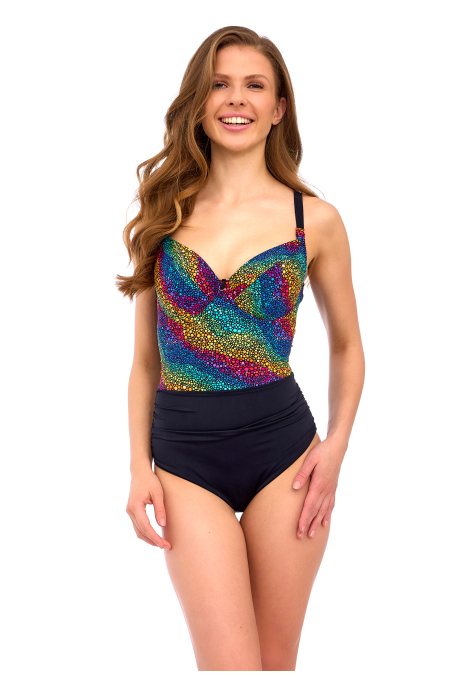 Jednoczęściowy kostium z kolekcji 2025, wykonany z dzianiny w czarnym kolorze oraz w kolorowe kropeczki imitujące tęczę. Doskonały do użytku zarówno na plaży, jak i na basenie. Fason stroju łączy funkcjonalność oraz elegancję. Kostium posiada wszyty biustonosz z miękkimi miseczkami na fiszbinach oraz regulowane, nieodpinane ramiączka. Część majteczkowa wykonana z czarnej lycry. Tył kostiumu zapinany na klamrę.