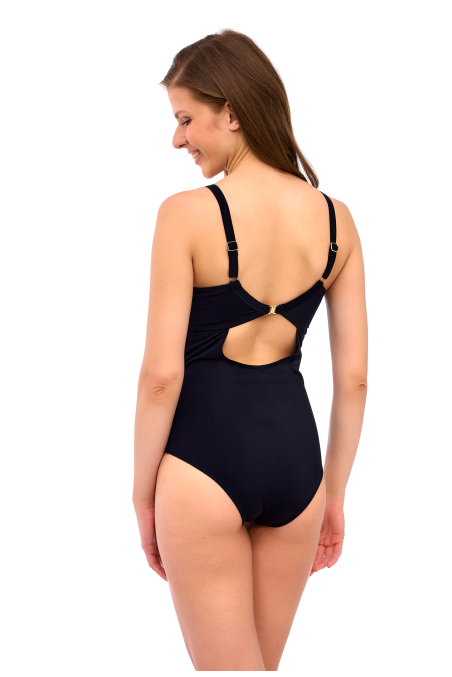 Jednoczęściowy kostium wykonany z dzianiny w etniczne, geometryczne wzory, doskonały do użytku zarówno na plażę jak i na basen. Fason stroju łączy funkcjonalność oraz elegancję. Kostium posiada wszyty biustonosz z miękkimi miseczkami na fiszbinach oraz regulowane, nieodpinane ramiączka. Szerokość i typ ramiączek dopasowane do rozmiaru kostiumu. Wstawki z czarnego materiału po bokach optycznie wyszczuplają i modelują sylwetkę. Tył kostiumu zapinany na klamrę.