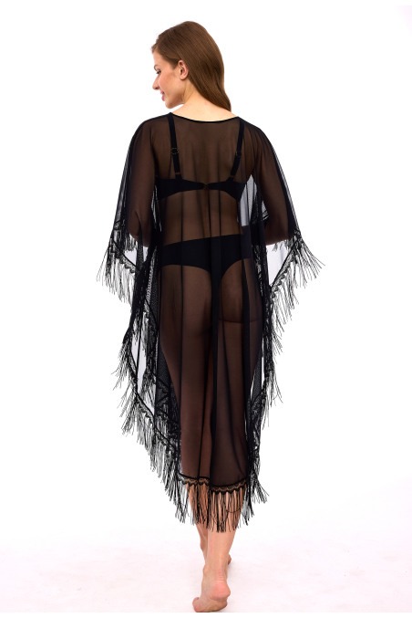 Piękne pareo w formie dłuższej tuniki, wykonane z czarnego tiulu z frędzelkami. Propozycja idealna zarówno na plażę, jak i dodatek do letniej stylizacji.