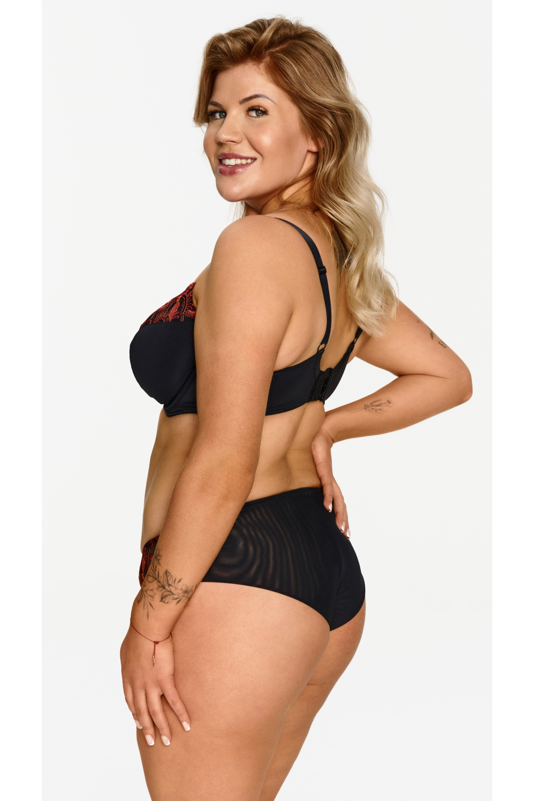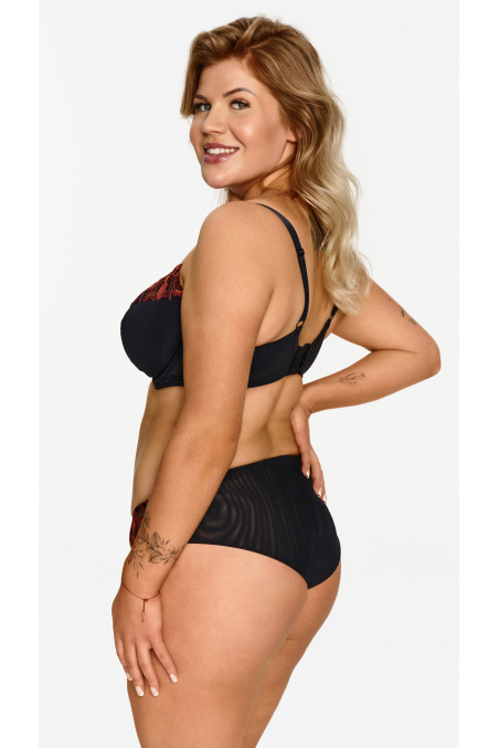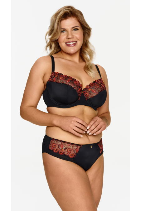 Ten miękki biustonosz z fiszbinami to idealny model na większy biust. Miękkie miseczki z fiszbinami świetnie podtrzymują, a jednocześnie pozwalają zachować naturalny kształt piersi. Czarna baza ozdobiona haftem w ciepłych jesiennych barwach sprawia, że biustonosz wygląda bardzo elegancko i stylowo.