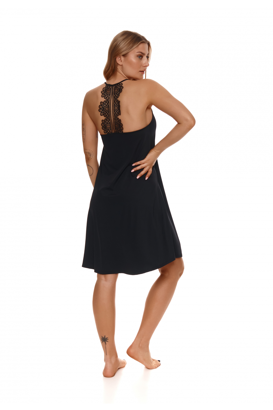 Czarna, klasyczna a zarazem elegancka koszulka idealna dla kobiet ceniących szyk i wygodę w jednym. Przód gładki, rozkloszowany, długość do kolana. Ramiączko regulowane, połączone z gipiura znajdującą się na plecach, która nadaje całości niepowtarzalnego charakteru.