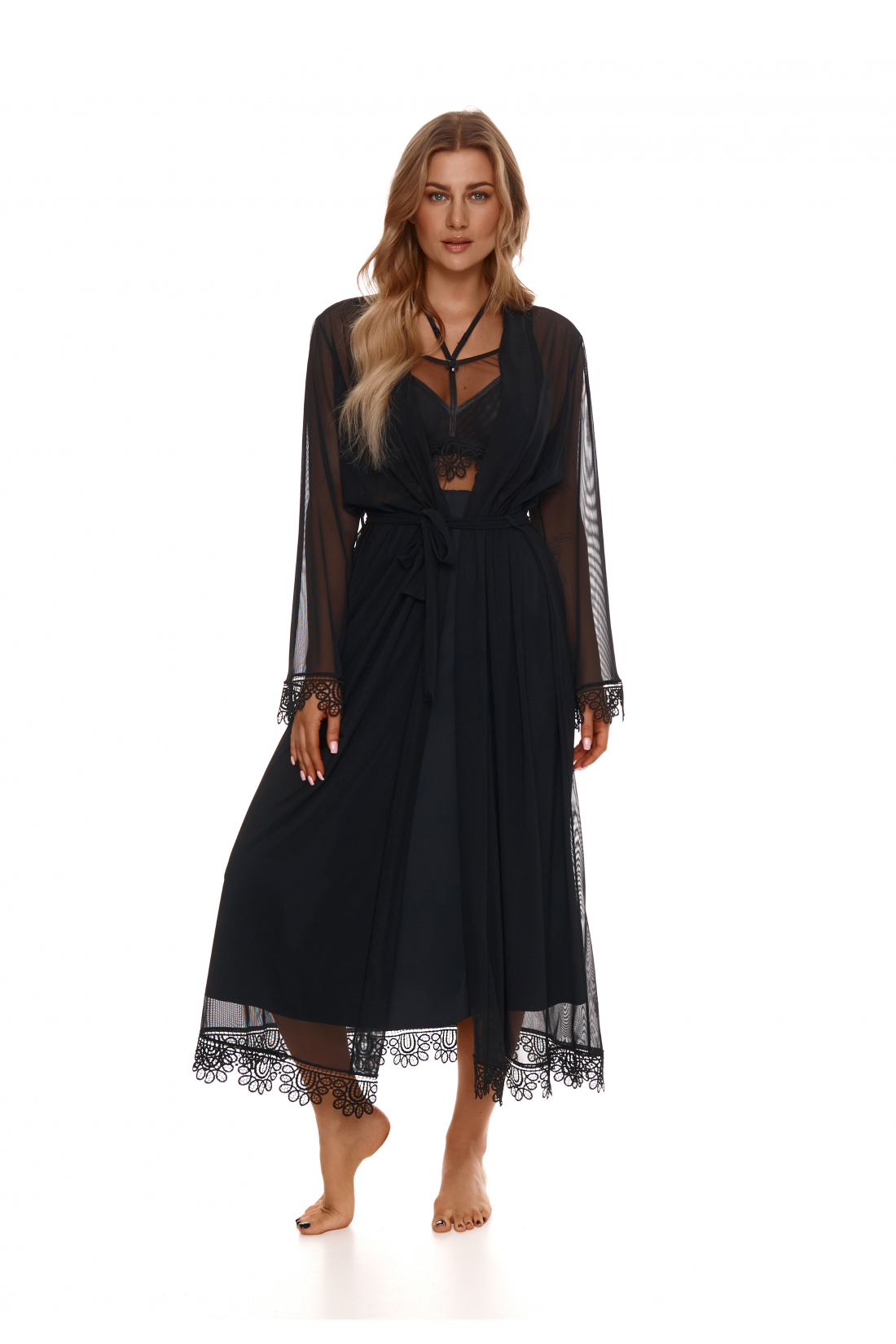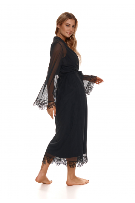 Peniuar długi, niezwykle elegancki. Wykonany z transpartnej, czarnej siatki ozdobiony gipiurą. Rękawy długie, szerokie. Model przeznaczony dla Pań hojniej obdarzonych przez naturę.